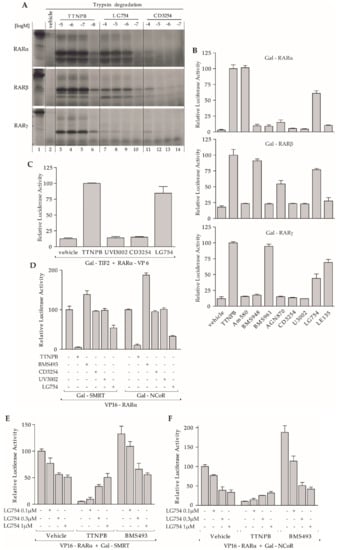 Besides the activation induced by LG754 in the MRLN system, we observed that co-incubation with the RAR antagonist AGN870 led to a decrease in the transactivation caused by LG754 alone (Figure 5D). Although it has been previously proposed that binding of LG754 to RXR allosterically activates RAR (a phenomenon referred to as “the phantom effect”) [,], the aforementioned observation suggests that LG754 could also bind to RAR, and be competed off by AGN870. Consequently, we carried out experiments to investigate whether this modulator is capable of interacting with the three RAR subtypes. Limited proteolysis was conducted because a conformational change in the RAR LBD occurs after ligand binding causing greater resistance to trypsin digestion. As a result, proteolysis assays can be used to monitor ligand binding and evaluate binding affinity as the proteolytic resistance of protected fragments is dependent on ligand concentration []. Limited trypsin digestion assays of in vitro translated RARα, β, and γ in the presence of either TTNPB, LG754 or CD3254 were performed. Note that TTNPB was used in a range of concentrations from 10 nM to 10 µM, instead of 1 nM to 100 nM for both LG754 and CD3254 (Figure 6A). Specifically, under our experimental conditions, the first effects were observed at TTNPB concentrations around 10 nM, in keeping with the high affinity of this ligand for RARs, and the highest degree of resistance was achieved at 100 nM. In contrast, no significant CD3254-dependent protection of RARs was observed, protection starting only at the very high concentration of 100 µM, confirming the inability of this molecule to significantly bind to RARs. Importantly, RARs showed LG754-dependent sensitivity from around 100nM, indicating a LG754-induced conformational change of RAR LBDs as a result of LG754 binding, but also a difference of relative affinity of around two orders between LG754 and TTNPB. Interestingly, LG754-RAR LBD complexes were more sensitive to proteolytic digestion than TTNPB suggesting that these two compounds differently stabilized RAR LBDs. Taken together, partial proteolytic digestion with trypsin supported the idea that LG754 binds to all three RAR paralogs but with a lower binding affinity than TTNPB.
