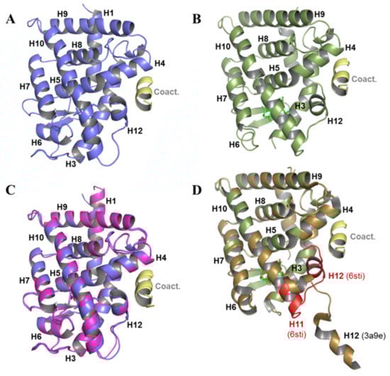 3D crystal structure of RARβ and RXRα LBDs in complex with LG754 and a coactivator peptides. (A) cartoon representation of RARβ LBD. Helices are numbered from H1 to H12, the latest being the activation helix that adopts the agonist conformation. The coactivator peptide (SCR1 NR2) bound to the surface formed by H3, H4, and H12 of RARβ is shown in yellow. The ligand LG754 is shown by stick representation; (B) cartoon representation of RXRα LBD. The coactivator peptide (TIF2 NR2) bound to the protein is shown in yellow; (C) superposition of the two complexes of RARβ LBD bound to LG754 and coactivator peptide observed in the asymmetric unit; (D) superposition of our complex of RXRα LBD bound to LG754 and coactivator peptide (same as in B) with the crystal structure of RXRα LBD bound to LG754 in the context of the heterodimer RARα-RXRα [] (PDB code 3a9e). In the latest structure, the activation helix H12 adopts an antagonist position protruding outside the LBD, whereas, in the present structure (PDB code 6sti), helix H12 (shown in red) folds back on the LBD in the agonist position.