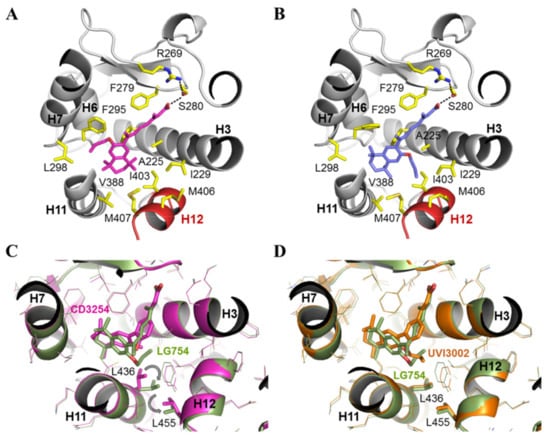 Structural basis of LG754 activity in RARβ and RXRα. (A,B) close-up view of LG754 in the LBP of RARβ as observed in the two molecules of the asymmetric unit. Side chains of residues in close contact with the ligand are shown as yellow sticks. In both cases, hydrogen bonds between the carboxylate group of LG754, R269 in H5 and S280 in the β-turn are highlighted in dashed black line. The propoxy group of the ligand points either toward helices H6 and H7 (in a) or toward helix H12 (in b); (C) close-up view of the superposition of RXRα LBP bound to LG754 (in green, PDB code 6sti) with RXRα LBP bound to CD3254 (in pink, PDB code 3fug) []. The propoxy group of LG754 pointing toward H12 induces a reorientation of L436 from helix H11, as compared to its position in the RXRα-CD3254 complex, generating a steric clash with L455 of helix H12; (D) close-up view of the superposition of RXRα LBP bound to LG754 (in green, PDB code 6sti) with RXRα LBP bound to UVI3002 (in orange, PDB code 2p1v) []. The aliphatic extension of UVI3002 induces the same positioning of L436 and L455, as observed in the structure of RXRα bound to LG754.
