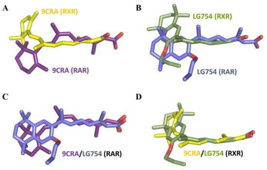 Conformation of the bound LG754 in RARβ and RXRα. (A) superposition of 9CRA as seen in the LBP of RXRα (PDB code 1fby) [] and RARβ (PDB code 1xdk) []; (B) superposition of LG754 as seen in the LBP of RXRα (PDB code 6sti) and RARβ (PDB code 6ssq); (C) superposition of LG754 and 9CRA as seen in the LBP of RARβ (PDB code 6ssq) and of 9CRA as seen in the LBP of RARβ (PDB code 1xdk) []; (D) superposition of LG754 as seen in the LBP of RXRα (PDB code 6sti) and of 9CRA as seen in the LBP of RXRα (PDB code 1fby) [].