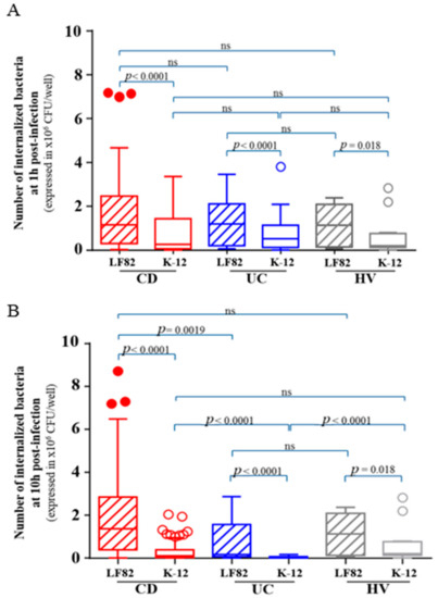 Number of internalized bacteria within macrophages at 1 h post-infection (A) and 10 h post-infection (B) in 95 CD patients, 30 ulcerative colitis patients and 15 healthy subjects. Statistical analysis was performed using Kruskall Wallis’ test and multiple comparisons and figure are performed using Tukey grouping. ns = not statistically significant.