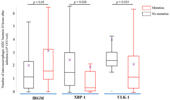 Results of the multivariate analysis of adherent and invasive E. coli survival within monocytes-derived macrophages from 95 Crohn’s disease (CD) patients according to the presence of the CD-associated polymorphisms IRGM (n = 27 patients, 28.4%), XBP1 (n = 13 patients, 13.7%) and ULK1 (n = 82 patients, 86.3%). The comparisons were performed using the Mann-Whitney test and the figure was presented with Tukey grouping. (Means are represented as purple crosses and median as horizontal lines; for IRGM, “no mutation” means patients who are not carrying CD-associated polymorphism IRGM; for XBP-1, “no mutation” means patients who are not carrying CD-associated polymorphism XBP-1; for ULK-1, “no mutation” means patients who are not carrying CD-associated polymorphism ULK-1).