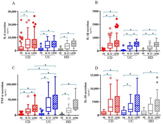 - Smith, A.M.; Rahman, F.Z.; Hayee, B.H.; Graham, S.J.; Marks, D.J.; Sewell, G.W.; Palmer, C.D.; Wilde, J.; Foxwell, B.M.J.; Gloger, I.S.; et al. Disordered macrophage cytokine secretion underlies impaired acute inflammation and bacterial clearance in Crohn’s disease. J. Exp. Med. 2009, 206, 1883–1897. [Google Scholar] [CrossRef] [PubMed]