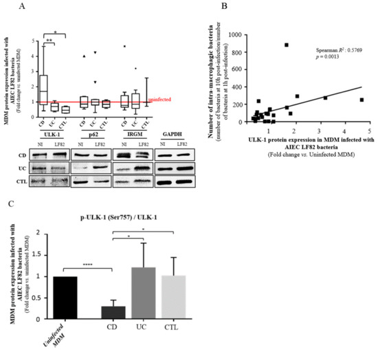 Autophagy plays a key role in managing AIEC infection [12,31]. After showing that the CD-associated polymorphisms IRGM and ULK-1 impacted AIEC survival in MDM from CD patients, we decided to confirm these data in vitro with samples of subjects remaining from the clinical protocol. We measured the level of IRGM and ULK-1 proteins as well as the level of p62, which is a protein used as a marker of autophagic flux, in AIEC LF82-infected MDM from CD patients, UC patients and healthy subjects (Figure 4A). Contrary to IRGM and p62, the level of ULK-1 protein was significantly increased within AIEC LF82-infected MDM from CD patients compared to MDM from UC patients or healthy subjects (approximately two-fold higher, p < 0.05) (Figure 4A). The level of ULK-1 protein was significantly correlated with the number of AIEC LF82 bacteria at 10 h post-infection within AIEC LF82-infected MDM from CD patients (ρ = 0.37; p = 0.033) (Figure 4B). As the level of total ULK-1 protein does not mean there are changes in its activity, we assessed the effect of AIEC on ULK-1 focusing on serine 757 phosphorylation which regulates negatively the autophagy process. We observed a significant decrease of the ratio p-ULK-1 on Ser757/total ULK-1, within macrophages from CD patients following AIEC infection compared to uninfected macrophages (p < 0.0001), UC patients (p = 0.0212) and healthy volunteers (p = 0.0186), highlighting the induction of autophagy in MDM from CD patients (Figure 4C). Also, as a marker of autophagy process, we measured LC3A/B levels in MDM from CD, UC and CTL by western blot. LC3A/B–II expression tends to increase following AIEC LF82 infection compared to uninfected MDM, regardless of the origin, suggesting the induction of autophagy (Figure S1).