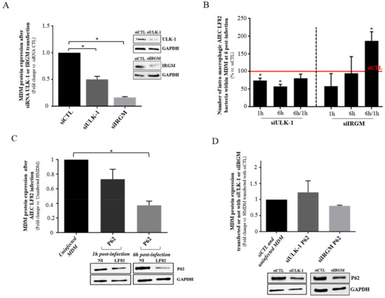 To validate the hypothesis of the potential impact of ULK-1 on AIEC clearance within macrophages and to compare it to another common autophagy protein IRGM, a short-term silencing of ULK-1 and IRGM was performed on MDM from blood donors (Figure 5A). We observed a reduced survival ability of AIEC LF82 at 1 h and 6 h post-infection within MDM transfected with siRNA targeting ULK-1 compared to those transfected with scramble siRNA (p = 0.0157 and p = 0.0018, respectively) (Figure 5B). By contrast, after siRNA IRGM silencing, the replication ability (6 h/1 h ratio) of AIEC LF82 within MDM increased compared to siRNA control (p = 0.0291). Besides, we aimed to assess the involvement of autophagy on the clearance of AIEC bacteria by the MDM from blood donors. We analyzed the impact of AIEC LF82 infection on p62 protein accumulation within MDM. We observed a significant decrease of p62 protein expression at 6 h post-infection within AIEC LF82-infected MDM compared to those non-infected (Figure 5C), highlighting the induction of autophagy. As expected, the down-regulation of ULK-1 and IRGM by siRNA prevented autophagy initiation as shown by the absence of p62 decrease at 6 h post-infection (Figure 5D), highlighting an impact of ULK-1 and IRGM on the autophagy process in AIEC-LF82 infected macrophages. In conclusion, these results suggest that AIEC could take advantage of the autophagy machinery at its early step, as ULK-1 is well described as an autophagy starter [32,33], contrary to IRGM.