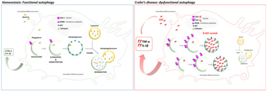 - Sadabad, M.S.; Regeling, A.; De Goffau, M.C.; Blokzijl, T.; Weersma, R.K.; Penders, J.; Faber, K.N.; Harmsen, H.J.M.; Dijkstra, G. The ATG16L1-T300A allele impairs clearance of pathosymbionts in the inflamed ileal mucosa of Crohn’s disease patients. Gut 2015, 64, 1546–1552. [Google Scholar] [CrossRef]