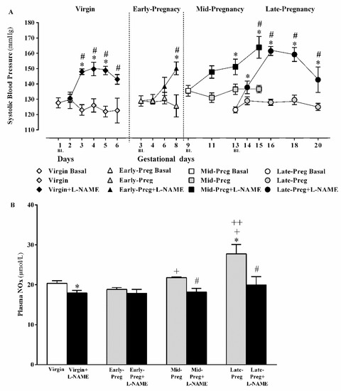 Systolic blood pressure measurements (A) and NO bioavailability in plasma (B) of virgin rats and Early, middle (Mid) and Late-pregnant rats treated with saline or L-NAME. Values are represented as mean ± SEM. In the panel A, *P < 0.05 versus baseline (BL) of each group and #P < 0.05 versus respective day of each group treated with saline. In the panel B, *P < 0.05 versus Virgin group, #P < 0.05 versus respective Mid-Preg or Late-Preg groups, +P < 0.05 versus Early-Preg or Early-Preg+L-NAME groups, and ++P < 0.05 versus Mid-Preg or Mid-Preg+L-NAME groups.