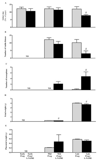 Fetal but not placental parameters were negatively affected by L-NAME, presenting significant reductions in litter size (#P < 0.05, Figure 2A) and number of viable fetuses (#P < 0.05, Figure 2B) with concomitant increases in number of resorptions (#P < 0.05, Figure 2C). Also, fetal weight (#P < 0.05, Figure 2D) but not placental weight (Figure 2E) presented reductions in Mid-Preg+L-NAME and Late-Preg+L-NAME compared to Mid-Preg and Late-Preg groups (#P < 0.05, Figure 2D).