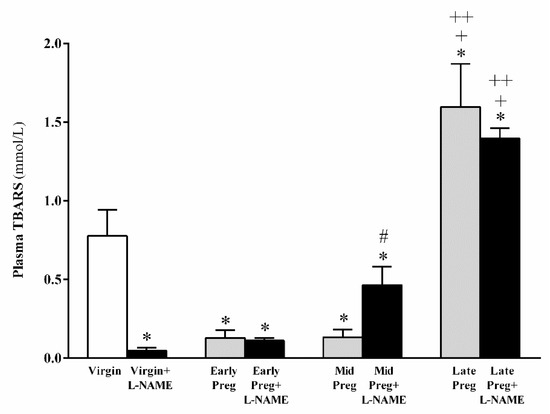 Oxidative stress of virgin rats and Early, middle (Mid) and Late-pregnant rats treated with saline or L-NAME. Values represent mean ± SEM. *P < 0.05 versus Virgin group, #P < 0.05 versus the Mid-Preg group, +P < 0.05 versus Early-Preg and Early-Preg+L-NAME groups, and ++P < 0.05 versus Mid-Preg and Mid-Preg+L-NAME groups.