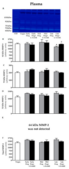 Representative zymography gel from the plasma (A). Gelatinolytic activity of 92 KDa MMP-9 (B), 75 KDa MMP-2 (C), 72 KDa MMP-2 (D), 64 KDa MMP-2 was not detected (E) and total MMP-2 (F) in virgin rats and Early, middle (Mid) and Late-pregnant rats treated with saline or L-NAME. Values represent mean ± SEM. *P < 0.05 versus the Virgin group, #P < 0.05 versus the Late-Preg group.