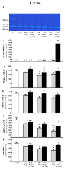 Representative zymography gel from the uterus (A). Gelatinolytic activity of 92 KDa MMP-9 was only detected in Late-Perg+LNAME group (B), and, 75 KDa MMP-2 (C), 72 KDa MMP-2 (D), 64 KDa MMP-2 (E), and total MMP-2 (F) in virgin rats and Early, middle (Mid), and Late-pregnant rats treated with saline or L-NAME. Values represent mean ± SEM. *P < 0.05 versus Virgin group, #P < 0.05 versus respective Early-Preg, Mid-Preg and Late-Preg groups, +P < 0.05 versus Early-Preg group and ++P < 0.05 versus Mid-Preg or Mid-Preg+L-NAME groups.