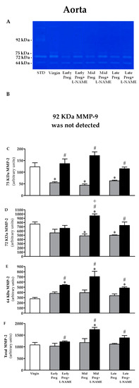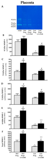 In normal pregnancy, previous studies have found that early-pregnant animals present increases in the activity of MMP-2 in uterus [22] and increases in placental MMP-9 [23]. Also, other authors reported increases in activity of MMP-2 and MMP-9 in the uterus and aorta during middle and late pregnancy stages, but decreases in placental activity of these two gelatinases were observed in late compared to middle pregnancy stages in animals [24,25]. Furthermore, in hypertensive disorders of pregnancy, excessive gelatinolytic activity of MMP-2 and MMP-9 in plasma [26,27], and increases in MMP-2 in urine [28] have been found in women. Of note, these earlier studies have focused on the end of pregnancy, however, considering the potential role of NO to downregulate the MMP-2 and MMP-9 [29,30,31,32,33,34], we hypothesized that reductions in NO bioavailability caused by Nω-Nitro-L-arginine methyl ester (L-NAME) [35,36] could increase the activity of MMPs throughout pregnancy stages, since L-NAME-induced hypertensive pregnancy causes fetal-placental growth restriction because of decreases in utero-placental perfusion, which is the result of aberrant vascular remodeling in the utero-placental circulation [37,38].