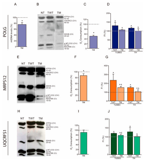 Effects of the overexpression of OXPHOS-related mutant proteins on neuroblastoma SH-SY5Y cells. (A–D) Wild-type (TWT) or Mutant (TM) POLG transfected cells. (A) Mitochondrial DNA (mtDNA) levels. Dashed line (100%) represents the mean value of undifferentiated TWT cells. The bar indicates the mean value and standard deviation (independent experiments, N = 4) of undifferentiated TM cells. * p < 0.05 (versus TWT cells, Mann–Whitney). (B) Levels of representative subunits of OXPHOS complexes. NT, non-transfected cells. ATP5A, complex V (CV) subunit; UQCRC2, complex III (CIII) subunit; SDHB, complex II (CII) subunit; p.MT-CO2, complex IV (CIV) subunit; and NDUFB8, complex I (CI) subunit. Molecular weights are also indicated. (C) Oxygen consumption. Dashed line (100%) represents the mean value of undifferentiated TWT cells. The bar indicates the mean value and standard deviation (N = 3) of undifferentiated TM cells. * p < 0.05 (versus TWT cells, Mann–Whitney). (D) Dopaminergic neuronal differentiation. FI, fluorescence intensity (flow cytometry) of dopaminergic neuronal markers TUBB3 and TH. Dashed line (100%) represents the mean values of undifferentiated TWT or TM cells. Bars indicate the mean values and standard deviations (N = 3) of differentiated TWT or TM cells. * p < 0.05 (versus undifferentiated TWT or TM cells, Mann–Whitney). & p < 0.05 (versus differentiated TWT cells, Mann–Whitney). (E–G) Wild-type (TWT) or Mutant (TM) MRPS12 transfected cells. (E) Levels of representative subunits of OXPHOS complexes. See panel B. (F) Oxygen consumption. (N = 3). See panel C. (G) Dopaminergic neuronal differentiation. (N = 6). See panel D. (H–J) Wild-type (TWT) or Mutant (TM) UQCRFS1 transfected cells. (H) Levels of representative subunits of OXPHOS complexes. See panel B. (I) Oxygen consumption. (N = 6). See panel C. (J) Dopaminergic neuronal differentiation. (N = 3). See panel D.