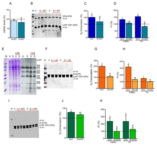 Effects of OXPHOS-xenobiotics on neuroblastoma SH-SY5Y cells. (A–D) Treatment with azidothymidine (AZT). (A) Mitochondrial DNA (mtDNA) levels. Dashed line (100%) represents the mean value of untreated undifferentiated (U) or differentiated (D) cells. Bars indicate the mean values and standard deviations (independent experiments, N = 2) of AZT-treated U or D cells. (B) Levels of the p.MT-CO1 subunit from complex IV (CIV) in untreated and AZT-treated (+AZT) cells. The nDNA-encoded complex II (CII) subunit SDHA was used to check the protein loading. Molecular weights are indicated. M, U, D code for molecular weight marker, undifferentiated (U) and differentiated (D) cells, respectively. (N = 3). (C) Oxygen consumption. Dashed line (100%) represents the mean value of untreated or treated undifferentiated (U) cells. Bars indicate the mean values and standard deviations (N = 3) of untreated (C) or treated (+AZT) differentiated (D) cells. * p < 0.05 (versus U cells, Mann–Whitney). & p < 0.05 (versus untreated D cells, Mann–Whitney). (D) Dopaminergic neuronal differentiation. FI, fluorescence intensity (flow cytometry) of dopaminergic neuronal markers TUBB3 and TH. Dashed line (100%) represents the mean value of undifferentiated (U) cells. Bars indicate the mean values and standard deviations (N = 3) of untreated (C) and treated (+AZT) differentiated (D) cells. * p < 0.05 (versus U cells, Mann–Whitney). & p < 0.05 (versus untreated D cells, Mann–Whitney). E-H) Treatment with linezolid (LIN). (E) Representative image of gels for mitochondrial protein synthesis analysis. Gels showing the loading control and electrophoretic patterns of mitochondrial translation products from untreated and treated (+LIN) cells are included. M, U, D code for molecular weight marker, undifferentiated (U) and differentiated (D) cells, respectively. Proteins p.MT-ND1-6 and p.MT-ND4L are CI mtDNA-encoded subunits; p.MT-CYB is a mtDNA-encoded subunit from CIII; p.MT-CO1-3 are mtDNA-encoded subunits from CIV; and p.MT-ATP6,8 are mtDNA-encoded subunits from CV. (N = 2). (F) Levels of p.MT-CO1 subunit in untreated and LIN-treated (+LIN) cells. β-ACTIN was used to check the protein loading. (N = 2). See panel B. (G) Oxygen consumption. (N = 3). See panel C. (H) Dopaminergic neuronal differentiation. (N = 3). See panel D. (I–K) Treatment with atovaquone (ATO). (I) Levels of p.MT-CO1 subunit in untreated and ATO-treated (+ATO) cells. (N = 3). See panels B and F. (J) Oxygen consumption. (N = 3). See panel C. (K) Dopaminergic neuronal differentiation. (N = 4). See panel D.