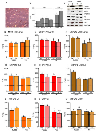 Effects of the high glucose and/or uridine on dopaminergic neuronal differentiation of OXPHOS-dysfunctional cells. (A–C) Neuroblastoma SH-SY5Y rho0 cells. (A) Neuron-differentiated rho0 cells. Arrowheads indicate neurites. (B) Dopaminergic neuronal differentiation with (+LIN) or without (-LIN) linezolid. FI, fluorescence intensity (flow cytometry) of dopaminergic neuronal markers TUBB3, NESTIN, TH and DAT. Dashed line (100%) represents the mean value of undifferentiated (U) rho0 cells. Bars indicate the mean values and standard deviations (independent experiments, N = 3) of differentiated (D) rho0 cells. * p < 0.05 (versus U rho0 cells, Mann–Whitney). (C) Levels of dopaminergic neuronal markers in untreated (−LIN)- or treated (+LIN)-undifferentiated (U) and differentiated (D) rho0 cells. (N = 2). β-ACTIN was used to check the protein loading. (D–F) Neuronal differentiation of SH-SY5Y rho+ cells in high glucose (GLC) and uridine (Ur) media. (D) SH-SY5Y rho+ cells overexpressing wild-type (TWT) or mutant (TM) MRPS12 protein. FI, fluorescence intensity (flow cytometry) of dopaminergic neuronal markers TUBB3 and TH. Dashed line (100%) represents the mean value of undifferentiated (U) cells. Bars indicate the mean values and standard deviations (N = 3) of differentiated (D) cells. * p < 0.05 (versus U cells, Mann–Whitney). & p < 0.05 (versus TWT D cells, Mann–Whitney). (E) Untreated (C) or linezolid treated (+LIN) SH-SY5Y rho+ cells. FI, fluorescence intensity (flow cytometry) of dopaminergic neuronal markers TUBB3 and TH. Dashed line (100%) represents the mean value of undifferentiated (U) cells. Bars indicate the mean values and standard deviations (N = 3) of differentiated (D) cells. * p < 0.05 (versus U cells, Mann–Whitney). (F) Linezolid (LIN)-treated SH-SY5Y rho+ cells overexpressing wild-type (TWT) or mutant (TM) MRPS12 protein. FI, fluorescence intensity (flow cytometry) of dopaminergic neuronal markers TUBB3 and TH. Dashed line (100%) represents the mean value of undifferentiated (U) cells. Bars indicate the mean values and standard deviations of differentiated (D) cells. * p < 0.05 (versus U cells, Mann–Whitney). G-I) Neuronal differentiation of SH-SY5Y rho+ cells in high glucose (GLC) media. (G) SH-SY5Y rho+ cells overexpressing wild-type (TWT) or mutant (TM) MRPS12 protein. (N = 3). See panel D. (H) Untreated (C) or linezolid treated (+LIN) SH-SY5Y rho+ cells. (N = 3). * p < 0.05 (versus U cells). # p < 0.05 (versus untreated D cells, Mann–Whitney). See panel E. (I) Linezolid (LIN)-treated SH-SY5Y rho+ cells overexpressing wild-type (TWT) or mutant (TM) MRPS12 protein. (N = 3). * p < 0.05 (versus U cells). $ p < 0.05 (versus LIN-treated TWT D cells, Mann–Whitney). See panel F. (J–L) Neuronal differentiation of SH-SY5Y rho+ cells in high uridine (Ur) media. (J) SH-SY5Y rho+ cells overexpressing wild-type (TWT) or mutant (TM) MRPS12 protein. (N = 3). See panel D. (K) Untreated (C) or linezolid treated (+LIN) SH-SY5Y rho+ cells. (N = 3). See panel E and H. (L) Linezolid (LIN)-treated SH-SY5Y rho+ cells overexpressing wild-type (TWT) or mutant (TM) MRPS12 protein. (N = 3). See panel F.