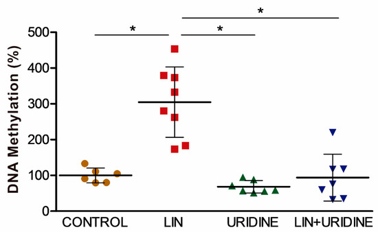 We supplied pregnant mice daily between embryonic days E8 and E15 with vehicle, 5 mg LIN, 70 mg uridine or 5 mg LIN plus 70 mg uridine. The fetus brains were analyzed on embryonic day E16. There were no significant differences in CIV activity or quantity; in dopamine concentration; in TH or DAT amount; in En1, Nr4a2 and Pitx3 mRNA levels; or in miRNA 124, 132 or 133 levels (Figure S11). However, LIN increased global DNA methylation in fetal brain (Figure 4) and, remarkably, uridine was able to reduce it.