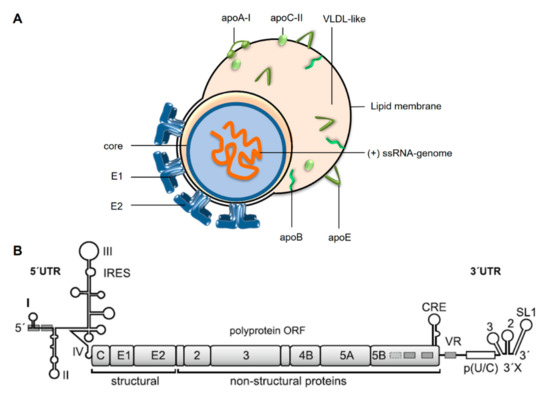 HCV comes as a so-called lipo-viro particle (Figure 1A) [8,9]. The particle is a fusion between viral and cellular components, with the involvement of cellular components largely exceeding what is usually recruited by other enveloped viruses. This is due to the close association of HCV’s assembly pathway with the assembly of Very Low-Density Lipoproteins (VLDL) [8,9]. Cellular proteins included in the lipo-viro particles are apolipoproteins (Apo) A-I, B, C-II and E (Figure 1A). The viral genome is covered by the HCV core protein, and the viral envelope contains proteins E1 and E2. Binding of HCV to hepatocytes and its uptake into the cells is conferred by several cellular receptors (comprehensively reviewed in [9,10,11]).
