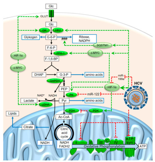 Upstream of the PDH bottleneck reaction, HCV activates enzymes of glycolysis and the pentose phosphate pathway (Figure 3). Consequently, higher metabolite concentrations were found in HCV-infected subjects, including lactate, pyruvate and amino acids [88]. Both HIF-1α and the proto-oncogene c-MYC were expressed at significantly higher levels in HCV-infected human liver and hepatocytes than in uninfected controls, and HIF-1α and c-MYC, in turn, induce the expression of several glycolysis key enzymes [84,85]. These glycolytic key enzymes are glucokinase (GK), phosphofructoinase-1 (PFK-1) and pyruvate kinase (PK) which together, control metabolite flux through the glycolysis. In addition, the expression of hexokinase 2 (HK2) is upregulated [64] and the activity of hexokinase is increased by its interaction with HCV protein NS5A [89]. In addition, HCV activates the phosphatidyl-inositol-3-kinase (PI3K) - Akt - mammalian target of rapamycin (mTOR) pathway [90,91,92,93] that is usually activated by growth hormones in the presence of sufficient amino acid levels. In particular, HCV translation is upregulated by this pathway [94,95].