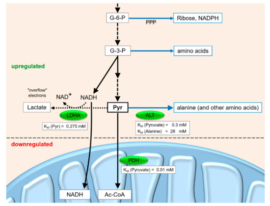 The second important key reaction branching from the pyruvate junction is the alanine aminotransferase (ALT) reaction. The KM of ALT for the educt pyruvate is about 0.3 mM, and the KM for the product alanine is 28 mM [115,116]. Thus, in cancer cells, the ALT reaction can be regarded to favor the production of alanine from pyruvate, while alanine feedback inhibits the upstream PKM2 activity according to the requirements for the respective amino acids. In contrast, in normal hepatocytes, the inhibition of PK by alanine would save glucose for the brain under conditions when enough amino acids, including alanine, come into the liver from the periphery.