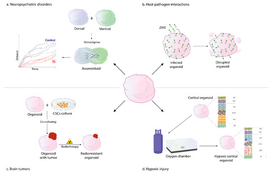 iPSC-derived neural organoids in disease modeling. The figure shows examples of different diseases modelled using neural organoids. Neuropsychiatric disorders, such as Timothy syndrome, can be modelled with dorsal and ventral forebrain organoids generating assembloids, which exhibit alterations in neuronal saltatory migration that can be corrected with the l-type channel blocker nimodipine (upper left corner). Zika virus-host interaction in human neural organoids leads to morphological and cytoarchitectural abnormalities (upper right corner). Neural organoids can be co-cultured with cancer stem cells (CSCs) to model human brain tumors and test therapeutic approaches such as radiotherapy (lower left corner). Cortical organoids exposed to low oxygen concentration in gas chambers recapitulate some cytoarchitectural abnormalities present in fetal hypoxic injury (lower right corner).
