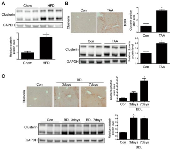 First, we investigated whether the expression level of clusterin is altered in the fibrotic liver. Immunohistochemical analyses of liver tissues from 11 patients with control samples and 14 patients with cirrhosis revealed that the expression level of clusterin was upregulated in the cirrhotic condition (Figure 1). Next, we confirmed the expression of clusterin in the fibrotic animal models. In the livers of non-alcoholic fatty liver disease mice fed a high-fat diet for one year, clusterin expression was higher than that in control mice (Figure 2A). Subsequently, we induced hepatic fibrosis in mice by intraperitoneal injection of TAA for eight weeks. Immunohistochemical staining and western blotting showed that clusterin expression was higher in the livers of TAA-injected mice than those of control mice (Figure 2B). In addition, clusterin was highly expressed in mice that underwent BDL, another model of liver fibrosis (Figure 2C). Overall, these data suggest that clusterin plays an important role in hepatic fibrosis.