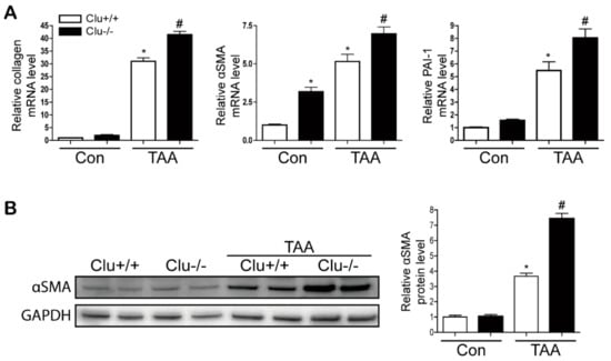 Loss of clusterin increases the expression of type I collagen, αSMA, and PAI-1 after TAA injection. (A) Representative real-time RT-PCR analyses of type I collagen, αSMA, and PAI-1 mRNA levels in the livers of control (Con) and TAA-injected wild-type (Clu+/+; white bars) and clusterin KO (Clu−/−; black bars) mice. * p < 0.05 compared with Clu+/+, # p < 0.05 compared with Clu+/+ after TAA injection. (B) Representative western blot analysis of αSMA expression in the livers of wild-type (Clu+/+) and clusterin KO (Clu−/−) mice after TAA injection. Data in the graph are represented as the mean ± SEM. * p < 0.05 compared with Clu+/+, # p < 0.05 compared with Clu+/+ after TAA injection.