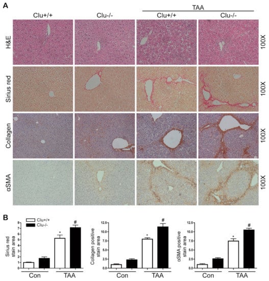 Loss of clusterin accelerates hepatic fibrosis after TAA injection. (A,B) Representative images of hematoxylin and eosin (H&E), Sirius red, and immunohistochemical staining of liver tissue sections from wild-type (Clu+/+) and clusterin KO (Clu−/−) mice after TAA injection. Areas of positive staining with Sirius red and antibodies were quantified by computer-based morphometric analysis. All morphometric data were normalized against the corresponding values in Clu+/+ mice, and data in all graphs are expressed as fold-increases relative to the Clu+/+ mice. Data are represented as the mean ± SEM of five random fields from each liver. Original magnification, ×100. * p < 0.05 compared with Clu+/+, # p < 0.05 compared with Clu+/+ after TAA injection.