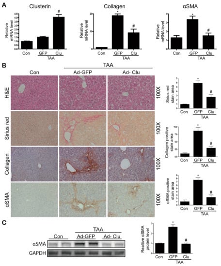 3.3. Clusterin Ameliorates TAA-Induced Hepatic Fibrosis