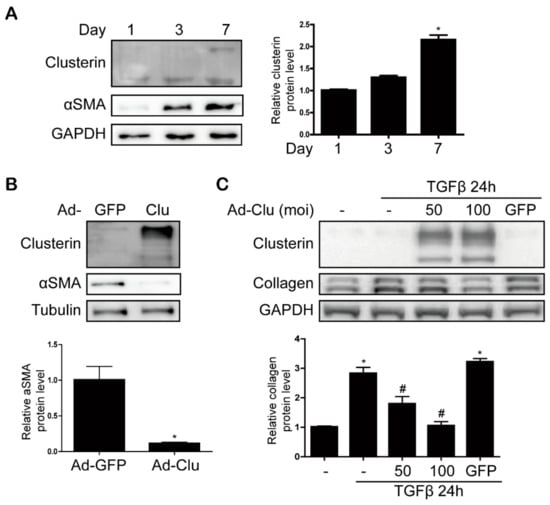 Clusterin inhibits αSMA in primary HSC and collagen expression in LX2 cells. (A) Representative western blot analysis of clusterin during HSC activation. Data in the graph are represented as the mean ± SEM of three independent measurements. * p < 0.05 compared with Day 1. (B) Western blot analysis of αSMA expression in cultured HSCs. Primary HSCs were infected with Ad-Clu and harvested 24 h later. Data in the graph are represented as the mean ± SEM of three independent measurements. * p < 0.05 compared with Ad-GFP. (C) Western blot analysis showing the effect of clusterin on TGF-β-induced collagen expression in LX2 cells. Data in the graph are represented as the mean ± SEM of four independent measurements. * p < 0.05 compared with the control, # p < 0.05 compared with TGF-β.