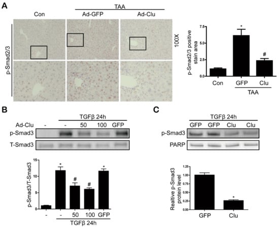 TGF-β/Smad signaling is a central regulator of liver fibrosis, in which Samd3 plays a major role. Phosphorylation of Smad3 and its subsequent nuclear translocation are critical steps in the signaling cascade leading to hepatic fibrosis [16,17]. Therefore, we investigated whether clusterin inhibits Smad3 phosphorylation. As expected, the levels of phosphorylated Smad3 were higher in TAA-injected mice than in control mice, but overexpression of clusterin attenuated this increase (Figure 7A). Consistent with the results of the in vivo experiments, clusterin attenuated TGF-β-induced Smad3 phosphorylation and nuclear translocation in LX2 cells (Figure 7B,C).