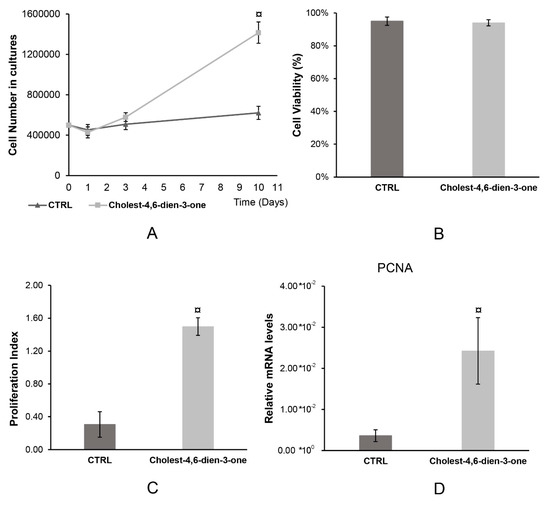 Population doubling (PD) was calculated using the equation described in Materials and Methods and the value obtained by trypan blue exclusion assay after 10 days of treatment. At day 10, hBTSC cultured in KM supplemented with cholest-4,6-dien-3-one showed a very significantly enhanced proliferation index (1.50 ± 0.11; N = 6; p < 0.0001) when compared to hBTSCs culture in KM (0.31 ± 0.16; N = 6) (Figure 1C). To confirm the enhanced proliferation rate, PCNA gene expression was analyzed by RT-qPCR. From our data, hBTSCs cultured for 10 days in KM supplemented with cholest-4,6-dien-3-one showed higher PCNA gene level (2.42 × 10−2 ± 8.11 × 10−3; N = 6; p < 0.0001) than cells cultured in KM (3.61 × 10−3 ± 1.42 × 10−3; N = 6) (Figure 1D). These data observed propose that cholest-4,6-dien-3-one could play a pivotal role in hBTSCs proliferation without affecting cell viability.