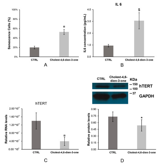 Cholest-4,6-dien-3-one induced cell senescence, impoved IL6 secretion and decreased relative mRNA and protein expression of hTERT. (A) Cell senescence in cultures determined by XGAL assay of hBTSCs cultured in KM added with cholest-4,6-dien-3-one or basal condition (KM). (B) IL-6 concentration in growth medium measured by ELISA of hBTSCs cultured in KM added with cholest-4,6-dien-3-one or basal condition (KM). (C) Relative hTERT RNA levels of expression analyzed by RT-qPCR of hBTSCs cultured in KM added with cholest-4,6-dien-3-one or basal condition (KM). (D) Relative hTert protein levels expression analyzed by Western blot of hBTSCs cultured in KM added with cholest-4,6-dien-3-one or basal condition (KM). Data expressed as mean ± SD of N = 6 experiments; * p < 0.05; $ p < 0.001; ¤ p < 0.0001.