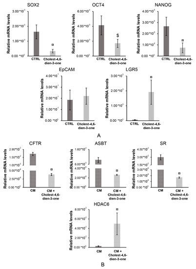 hBTSCs cultured in KM supplemented with cholest-4,6-dien-3-one for 10 days showed a significant reduction in relative mRNA levels of stem cell genes, such as SOX2 (p < 0.0001; N = 6), OCT4 (p < 0.001; N = 6), and NANOG (p < 0.0001; N = 6) when compared with hBTSCs cultured in basal condition (Figure 3). At the same time, cells exposed to cholest-4,6-dien-3-one for 10 days showed an increase of LGR5 mRNA levels (p < 0.0001; N = 6) when compared to hBTSCs cultured in KM, while only a trend towards an increase was observed in EpCAM mRNA levels expression (p > 0.05; N = 6) (Figure 3A). Moreover, hBTSCs were expanded in KM preconditioned for five days in CM and thereafter, exposed to CM or CM supplemented with cholest-4,6-dien-3-one for 10 days to mimic cholangiocyte differentiation and an injury along the differentiation, as may happen in bile duct regeneration [18]. From the results obtained, cholest-4,6-dien-3-one supplemented CM markedly impaired cell cholangiocyte differentiation as observed by a significant reduction of mature cell genes CFTR (p < 0.0001; N = 6), ASBT (p < 0.0001; N = 6), and SR (p < 0.0001; N = 6) compared to hBTSCs cultured in CM for 15 days (Figure 3B). As confirmed of cholangiocyte breaking up, e.g., primary cilium remodeling, higher mRNA levels of HDAC6 (p < 0.0001; N = 6) were observed in cells cultured in CM added with cholest-4,6-dien-3-one than cells cultured in CM (control) (Figure 3B). Taken together these results suggest that cholest-4,6-die-3-one could induce stem cells to become putative trans-amplifying compartment cells and, at the same time, could block the differentiation in mature cholangiocytes.
