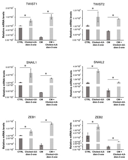 Cholest-4,6-dien-3-one enhanced the EMT markers analyzed by RT-qPCR. Relative gene expression of EMT markers (TWIST1, TWIST2, SNAIL1, SNAIL2, ZEB1, and ZEB2) examined by RT-qPCR of hBTSCs cultured in basal condition (KM), KM supplemented with cholest-4,6-dien-3-one, differentiation tailored cholangiocyte medium (CM) or CM added with cholest-4,6-dien-3-one. Data expressed as mean ± SD of N = 6 experiments; ¤ p < 0.0001.