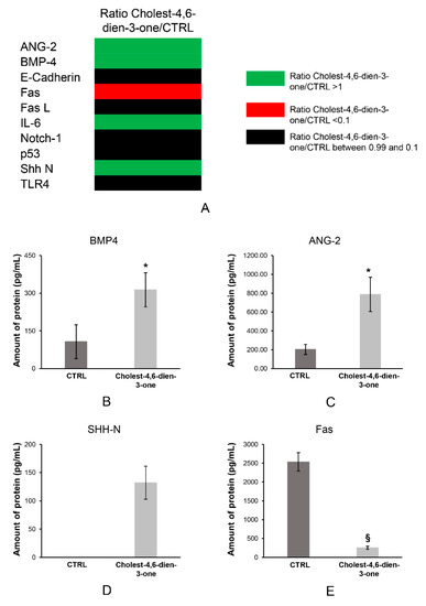 Protein extractions from hBTSCs cultured in KM or KM added cholest-4,6-dien-3-one underwent to pathway analysis by RayBiotech Inc. As reported in Figure 6A, the company analyzed a specific protein panels, including Ang-2, Bmp-4, E-Cadherin, Fas, FasL, IL-6, Notch-1, p53, Shh N, and Trl4. Results showed a significant increase in protein amount of Bmp-4 (CTRL: 106.89 ± 67.63 pg/mL; cholest-4,6-dien-3-one: 313.68 ± 67.74 pg/mL; N = 3: p < 0.05) (Figure 6B) and Ang-2 (CTRL: 203.75 ± 54.35 pg/mL; cholest-4,6-dien-3-one: 787.31 ± 181.56 pg/mL; N = 3: p < 0.05) (Figure 6C) in hBTSCs cultured in KM supplemented with cholest-4,6-dien-3-one with respect control cells. At the same time, Shh N-domain was observed only in hBTSCs exposed for 10 days at cholest-4,6-dien-3-one (132.00 ± 29.46 pg/mL; N = 3) and undetectable in cells cultured in basal condition (Figure 6D). Moreover, the presence of cholest-4,6-dien-3-one in KM induced a significant reduction of Fas receptor (253.48 ± 43.03 pg/mL; N = 3; p < 0.01) when compared to the same cells cultured in KM (2535.09 ± 245.57 pg/mL; N = 3) (Figure 6E). The data obtained suggest that cholest-4,6-dien-3-one could play a pivotal role in tumor insurgency, inducing EMT pathway activation and a tumor escape strategy by reduction of Fas receptor.