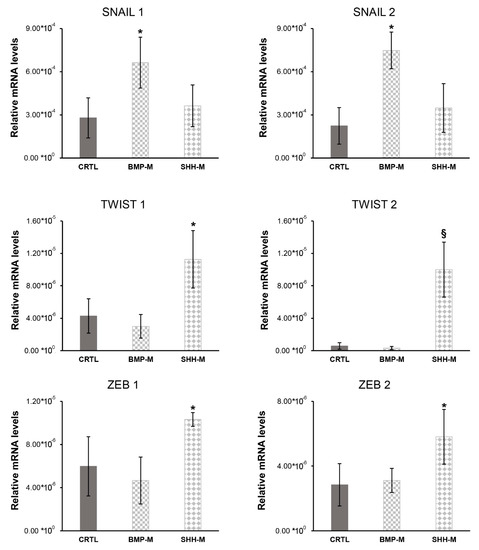 hBTSCs were cultured in a specific medium inducing Bmp (BMP-M) or Shh (SHH-M) pathway for 15 days. After this period, mRNA was extracted, and gene expression was analyzed by RT-qPCR. From our results, we observed a significative increase in SNAIL1 (N = 6; p < 0.05) and SNAIL2 (N = 6; p < 0.01) mRNA levels when cells were cultured in BMP-M respect to hBTSCs cultured in KM (Figure 6A). Simultaneously, hBTSCs cultured in SHH-M showed an increase of mRNA levels of TWIST1 (N = 6; p < 0.05), TWIST2 (N = 6; p < 0.01), ZEB1 (N = 6; p < 0.05) and ZEB2 (N = 6; p < 0.05) when compared to hBTSCs culture in basal condition (KM) (Figure 7). These results suggest that activation of Bmp and Shh pathways in hBTSCs induces the expression of EMT gene markers.