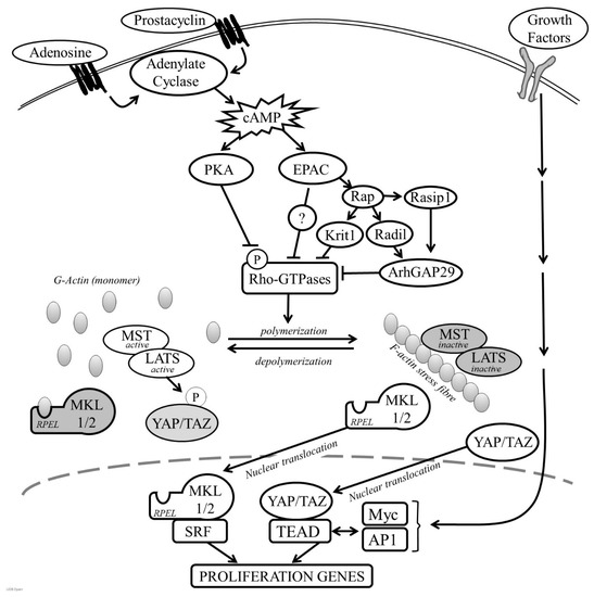 Role of actin remodelling in cAMP-induced growth arrest. In VSMC, cAMP activates Protein Kinase A (PKA) and Exchange Protein Activated by cAMP (EPAC), which synergise to inhibit RhoGTPase activity. EPAC1 activation can contribute towards RhoGTPase inhibition via Rap1 mediated activation of Krit1, Radil and Rasip1. However, some studies suggest that EPAC1 inhibits actin polymerisation and proliferation via a Rap1-independet mechanism. Under low cAMP conditions, the F:G actin ratio is high, allowing Megakaryocytic Acute Leukemia Protein (MKL)-1 and -2 to translocate to the nucleus where they activate serum response factor (SRF)-dependent gene expression. Actin polymerisation also inhibits the Hippo kinases Mammalian Sterile20-like (MST) and Large Tumor Suppressor Kinase (LATS), allowing YAP and TAZ to translocate to the nucleus where they activate TEA Domain (TEAD) transcription factor dependent gene expression. Reduced actin polymerisation in response to elevated cAMP causes an increase in actin monomer levels and activation of MST and LATS. LATS-mediated phosphorylation of Yes-Associated Protein (YAP) and Transcriptional Co-Activator With PDZ-Binding Motif (TAZ) triggers their nuclear export. Actin monomer binds to Megakaryocytic Acute Leukemia Protein (MKL) -1 and -2 via their N-terminal RPEL domains, triggering their nuclear export. This results in a reduction in the expression of serum response factor (SRF) and TEAD-dependent gene expression required for cell proliferation.