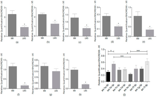 The let-7 family expression profiles in the LMS and MM samples. (a) Differential low expression was observed for let-7a (p = 0.0280), (b) let-7b (p = 0.0482), (c) let-7c (p = 0.0280), (d) let-7d (p = 0.0221), (e) let-7e (p = 0.0114), (f) let-7f (p = 0.0097), (g) let-7g (p = 0.1367), and (h) let-7i (p = 0.005) in LMS compared to MM, respectively. Samples were normalized endogenously. (i) A comparison of the fold expression of the eight members of the let-7 family in the LMS samples (* p < 0.05, ** p < 0.005 and *** p < 0.0001). Samples were normalized by endogenous and reference samples.