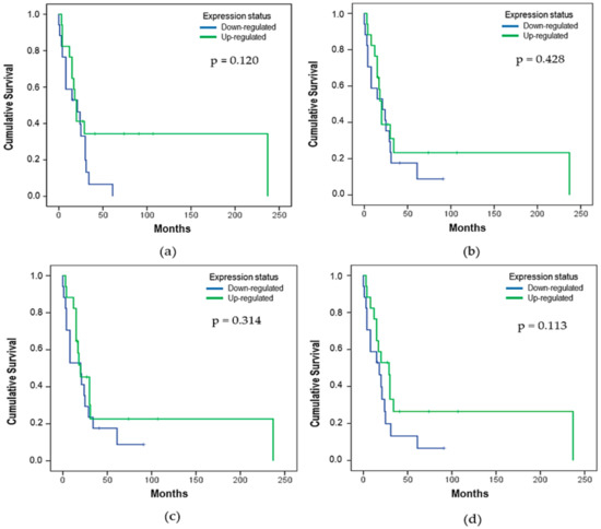 Effect of the expression status on overall survival (OS) for (a) let-7a (p = 0.120), (b) let-7b (p = 0.428), (c) let-7c (p = 0.314), and (d) let-7d (p = 0.113). The p-value was determined using the log-rank test that refers to the corresponding expression status (n = 34, 28 deaths, and 6 alive-censored).