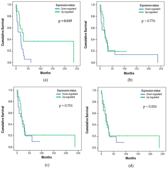 The effect of the let-7 expression status on OS analysis showed that the let-7e expression might influence the OS. Patients with downregulated let-7e (50%) had a median OS of 18 ± 5.48 months, with 17 deaths (none alive-censored), while patients with upregulated let-7e (50%) had a median of 30 ± 7.64 months and 11 deaths (6 alive-censored) (p = 0.015). Kaplan–Meier curves were used to compare the time of survival between the two different groups (Figure 3 and Figure 4).
