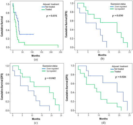 Kaplan–Meier curves showing (a) the difference in the time of the OS between treated patients (submitted to adjuvant therapy (AT)–radiotherapy and/or chemotherapy), including 18 cases and non-treated patients with 10 cases (28 deaths and 6 alive-censored) (log-rank test: p = 0.031). (b,c) The disease-free survival (DFS) of patients with LMS let-7b (p = 0.030) and let-7d (p = 0.042); the p-value was determined using a log-rank test that refers to the corresponding expression status (n = 21, 18 relapses, and 3 censored). (d) Adjuvant therapy analysis presented 6 relapses for non-treated patients and 12 relapses for treated ones over twenty-five months (18 relapses and 3 censored) (n = 21; p = 0.026).
