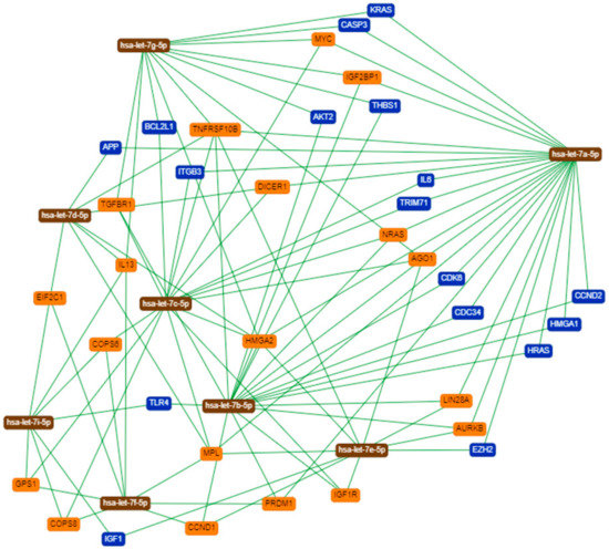 The network of genetic interactions of let-7 family and their main target-genes is described in Figure 6 and Figure 7.