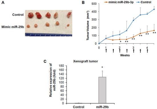 We examined whether mimic miR-29b treatment inhibits tumor growth in a PC3 xenograft mouse model. For this, we subcutaneously injected PC3 cells into hind flank of nude mice. When tumors were palpable (>70 mm3), mice were randomly divided into two groups, control and experimental groups. Control or mimic miR-29b was delivered by intratumor injection. We observed a significant reduction in tumor volume in mice receiving intratumoral injections of mimic miR-29b as compared to control mice (Figure 1A,B). At the end of the experiments, mice were sacrificed and tumors were removed for biochemical analysis. We did not observe any apparent toxicity. The body weight was similar in both groups and mice were macroscopically normal. miR-29b expression was examined in control mice and experimental mice. We observed significant up-regulation of miR-29b in experimental tumor compared to control tumors (Figure 1C). This result indicates a therapeutic potential of miR-29b against in vivo prostate tumor growth.