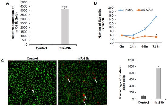 miR-29b inhibits prostate cancer cell growth. (A) PC3 cells were transfected with control or mimic miR-29b (50 nM). Expression of miR-29b was examined by qRT-PCR 48 h post-transfection. U6 gene was used as internal control. (B) PC3 cells were transfected with control or mimic miR-29b. At 0, 24, 48, and 72 h, cells were stained with trypan blue and number of live cells was counted using a hemocytometer. Data are presented as mean ± SD from three independent experiments. (C) Control or miR-29b transfected PC3 cells were stained with Calcein AM (green color for live cells) and ethidium homodimer-1 (red color for dead cells) dye to quantitate the live and dead cells by fluorescence microscopy. Magnification 10X and Scale bar 75 µm. Arrows indicate dead cells. Right panel shows quantitation of dead cells, calculated from five random fields. Small bar indicates standard error (* p < 0.05; *** p < 0.001).