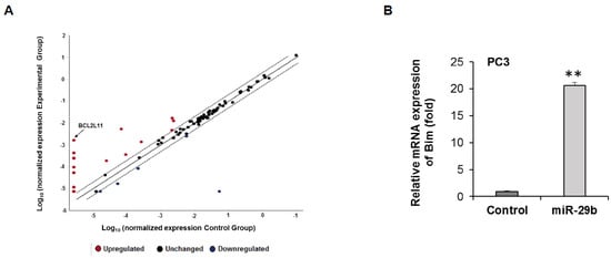 Transcriptomic analysis of miR-29b mimic transfected PC3 cells. (A) RNAs from control or miR-29b transfected PC3 cells were analyzed for pathway specific transcriptomic array using Human Cancer Pathway Finder RT2 profiler PCR Array (Qiagen). Relative fold change was analyzed using web-based software (Qiagen) using human β-Actin, β-2-microglobulin, glyceraldehyde-3-phosphate dehydrogenase, hypoxanthine phosphoribosyl transferase 1 and ribosomal protein, large, P0 genes as endogenous controls and presented graphically. (B) Total RNA was isolated from control or miR-29b transfected PC3 cells. Bim expression was measured by qRT-PCR and GAPDH was used as an internal control. The results are presented as mean ± SD from three independent experiments (**, p < 0.001).