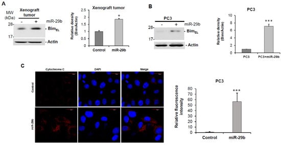 Since we observed the elevated expression of pro-apoptotic molecule Bim we wanted to know whether miR-29b induces Bim mediated apoptosis. The Bcl2 –family protein Bim belongs to the BH3-only protein family known as initiators of apoptosis. It was evident that during cell death, Bim is constitutively incorporated in the outer mitochondrial membrane via a C-terminal transmembrane anchor from where it can induce cytochrome C release from mitochondria [19,20,21,22]. Immunofluorescent analysis revealed significant induction of cytosolic cytochrome C in miR-29b overexpressed PC3 cells as compared to the control cells (Figure 4C). Cytochrome C can initiate the activation of caspase cascade once it is accumulated in cytosol [23]. We also observed a significant induction of cleaved PARP in both xenograft tumors treated with miR-29b and mimic overexpressed PC3 cells as compared to controls (Figure 4D,E). A similar result was observed when miR-29b was overexpressed in DU145 cells as compared to that of control cells (Figure 4F). Thus, miR-29b inhibits tumor progression by inducing Bim and thereby inducing apoptosis signaling in prostate cancer.