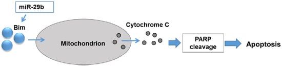 Schematic representation of role of miR-29b in induction of apoptosis in prostate cancer. miR-29b induces Bim expression resulting cytosolic accumulation of cytochrome C leading to PARP cleavage.
