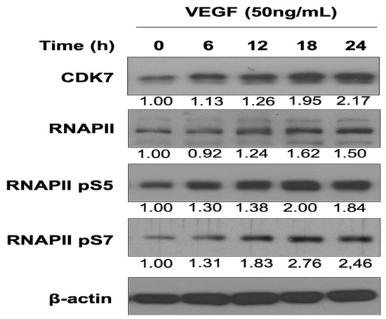 Vascular endothelial growth factor (VEGF) increased Cyclin-dependent kinase 7 (CDK7) and RNA polymerase II (RNAPII) expression and downstream RNAPII phosphorylation at serine 5 and 7 in human umbilical vein endothelial cells (HUVECs). HUVECs were treated with 50 ng/mL VEGF for 6–24 h. The cells were then harvested and subjected to Western blotting analysis using specific CDK7, RNAPII, RNAPII pS5, and RNAPII pS7 antibodies. Numbers under the plots indicate the fold change of protein level relative to their untreated control. Similar results were obtained in at least three independent experiments.