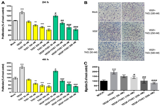 THZ1 suppressed the proliferation and chemotactic migration of HUVECs in a dose-dependent manner. (A) HUVECs (5 × 103 cells) in a 96-well-plate were treated with VEGF (50 ng/mL) and various concentrations of THZ1 (50, 100, 250, 500 nM) for 24 and 48 h. After incubation, HUVEC proliferation was analyzed by the water-soluble tetrazolium 1 (WST-1) assay. Data are presented as mean ± standard deviation. ** p < 0.01 and *** p < reach untreated mock control group; # p < 0.05, ## p < 0.01, and ### p < 0.001 compared to the each VEGF (50 ng/mL) treated group (B,C). The chemotactic motility of HUVECs was assayed by the Transwell assay. Cell suspension (100 µL) containing 2 × 104 cells of HUVECs was loaded into each upper well. VEGF (10 ng/mL) with or without various concentrations of THZ1 (50, 100, 250, and 500 nM) in 5% fetal bovine serum (FBS)-containing M199 were placed in the lower wells. The chamber was incubated at 37 °C for 4 h. After incubation, the cells were fixed and stained. Chemotaxis was observed by optical microscopy at 100× magnification and quantified to detect the cells that migrated to the lower side of the filter. *** p < 0.001 compared to the untreated mock control group; # p < 0.05, ## p < 0.01, and ### p < 0.001 compared to the VEGF (10 ng/mL)-treated group. Similar results were obtained in at least three independent experiments.