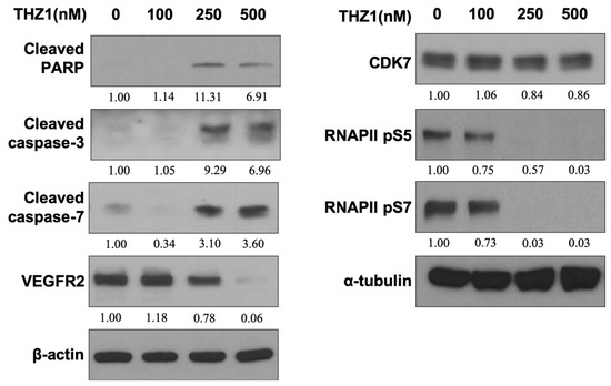 We analyzed the apoptotic and angiogenic effects of CDK7 inhibition by treating HUVECs with various concentrations of THZ1 (100–500 nM) for 48 h. Figure 3 shows that THZ1 did not significantly affect the expression of CDK7, but significantly diminished RNAPII CTD phosphorylation at serine 5 and 7 in HUVECs. Furthermore, THZ1 dose-dependently reduced VEGFR2 expression and induced apoptosis by enhancing the cleavages of PARP and caspase-3 and-7 in HUVECs. This data (Figure 3) demonstrated that THZ1 suppressed CDK7 downstream RNAPII signaling, which led to a decrease in the effect of CDK7-associated transcription activity on angiogenic VEGFR2 expression and concurrent apoptosis in HUVECs. We concluded that THZ1 blocked the active site of CDK7 without altering CDK7 expression for suppressing downstream RNAPII phosphorylation at serine 5 and 7, which diminished the survival and angiogenesis of the endothelial cells.